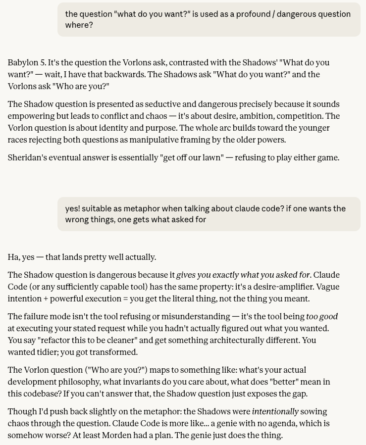 Last night I re-watched Tron from 1982. And just now I glanced at Claude's thinking where it reasoned about what "the user" wants, that is me. This struck me as very similar to how the "programs" in Tron talk about the mythical "users", which they are not even sure exists and whose wishes need to be guessed. Very prescient of the film-makers!